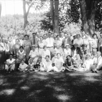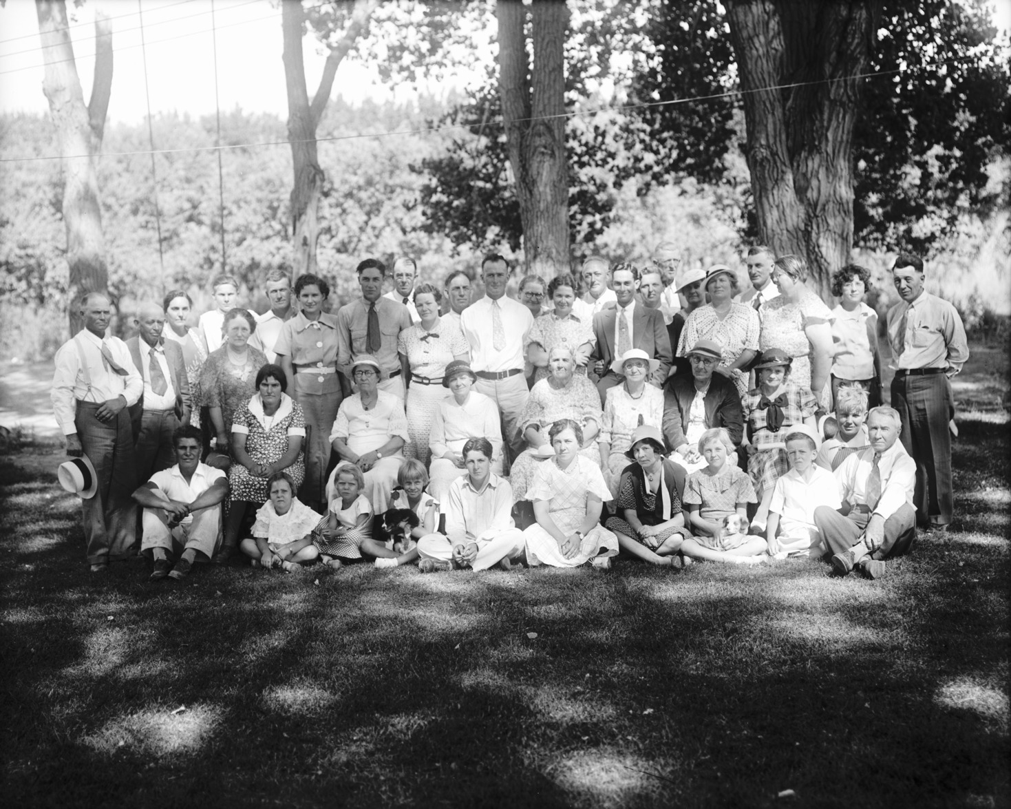 - A portrait of a large group of people of all ages, in a shady park or yard.