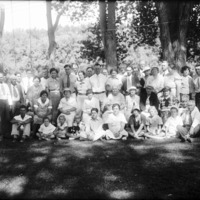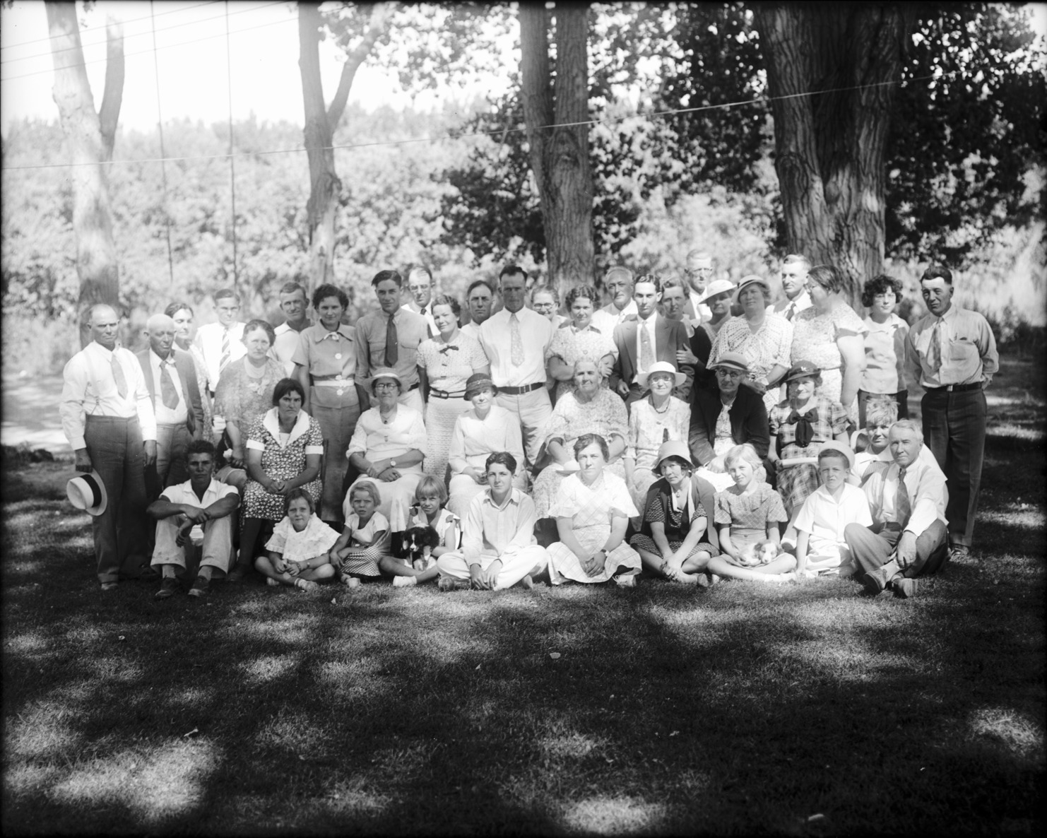 - A portrait of a large group of people of all ages, in a shady park or yard.