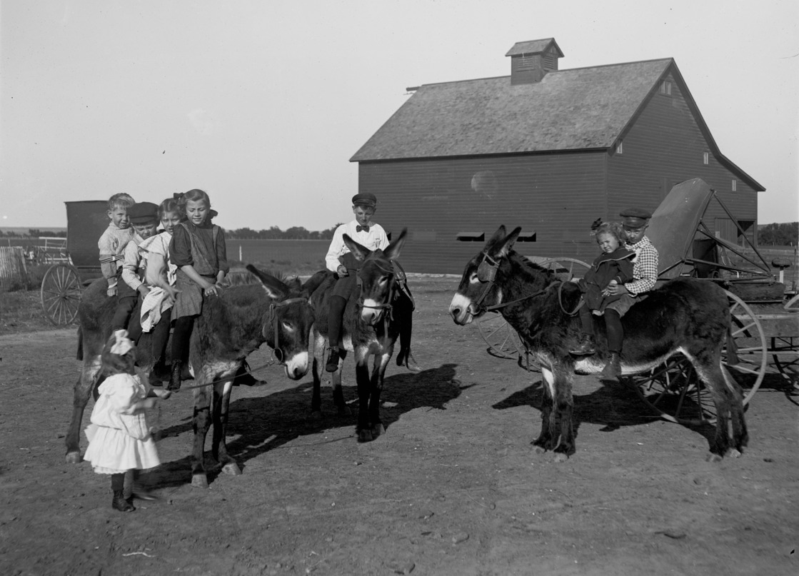 - Eight children on and by three donkeys in a barnyard; large barn in background.