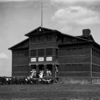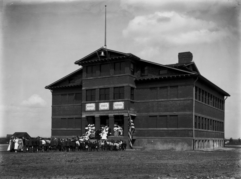 - Bickel School shortly after construction, with a large crowd of mostly children lined up in front.