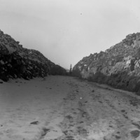 - Empty canal channel through rock, a construction tower or drilling rig in the distance.