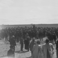 - A large group of men gathered around a speaker in a field; horses and/or cattle and a townsite in the distance.