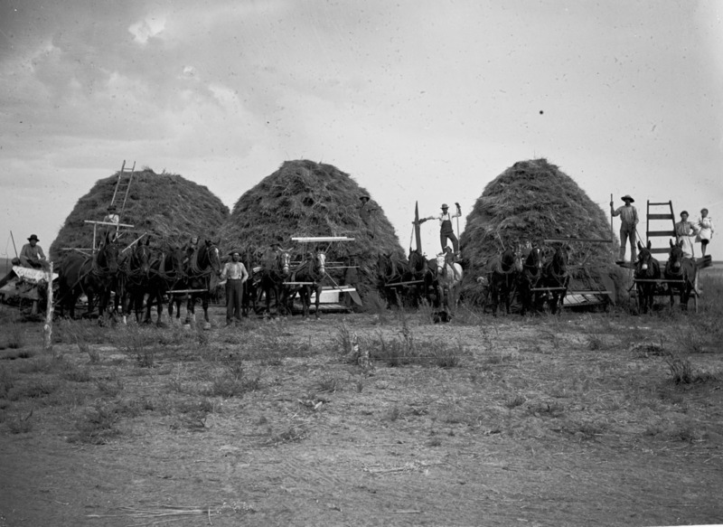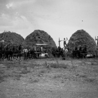 - Five harvesting crews and teams of horses, posing before three large stacks of grain. Children on some of the horses.