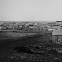 - A wide view of early Twin Falls, looking west, visible buildings include the Hall House and the Hotel Perrine.