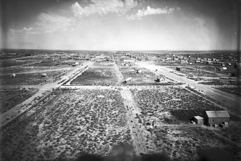 - An aerial view of early Twin Falls, looking northwest, taken from atop a water tower.