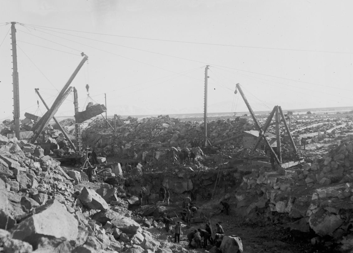 - Construction crews and derricks moving rock in a canal bed.