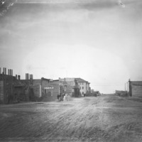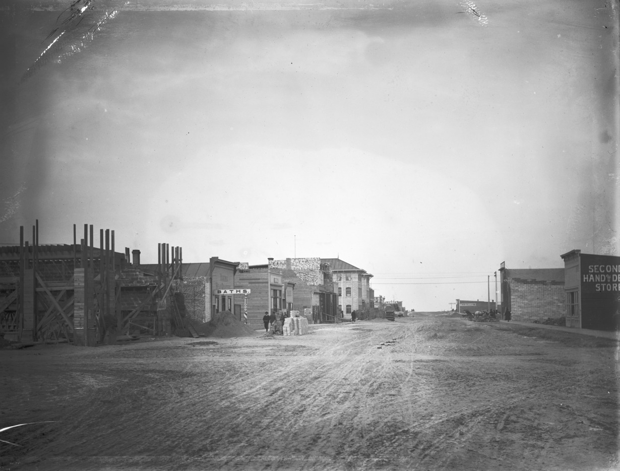 - View of Main Ave, looking northwest, showing new construction underway. The Hotel Perrine is in the center background. Also visible are Yakima Headquarters (Baths), McCornick Bank on left; furniture store, Twin Falls Times and secondhand store on right.
