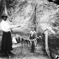 - A woman and boy stand in front of a canyon wall, displaying a stringer of caught fish.