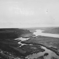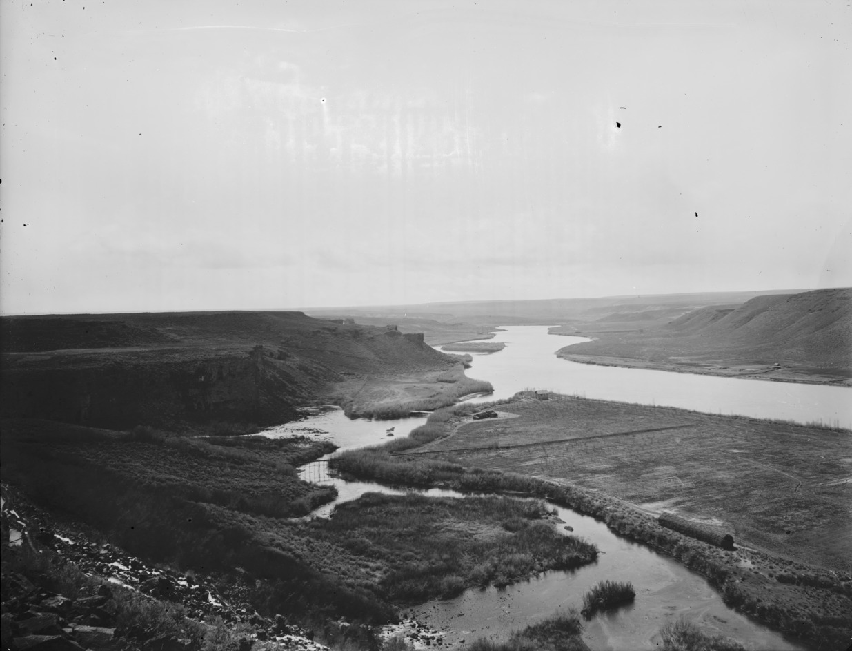 - The Snake River in a broad valley section near Hagerman. Looking south across Ritter Island, where a house and haystacks are visible.