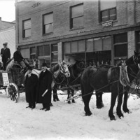 "Feb 23, 1910;" Men, a team of horses, and a freight wagon stand in the snow in front of the Boyd Building. A sign on the wagon reads, "Off for 'Jarbidge' - Loaded and Packed by Meyer and Company Outfitters." Other businesses and buildings visible are Dr McAtee, Dentist; Adella R. Nichol, Physician; Burton E, Morse and Holmes G. Lash, Architects;