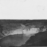 - Wide view of Shoshone Falls; Power plant on north side and Shoshone Hotel on south side of the Snake River Canyon are visible.