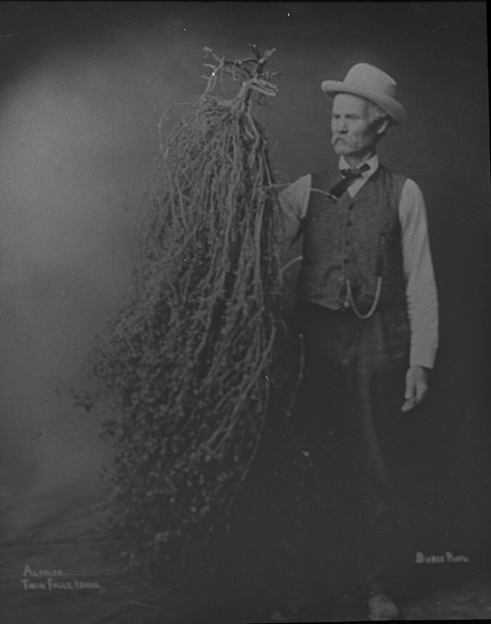 - "Alfalfa;" man in studio, holding a large alfalfa plant.