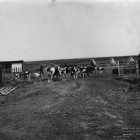 - "Holstein Calves; Overbrook Farms; Jerome, Idaho;" several men stand alongside a herd of cows as they direct them down a fenced lane into a pasture. A few pigs stand in a fenced area on right.