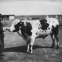 - "Holstein Bull; Overbrook Farms, Jerome, Idaho;" a man stands holding a rope tied to the nose ring of a cow.