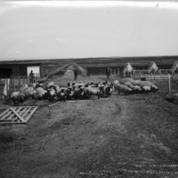 - "Thoroughbred Hampshires; Overbrook Farms, Jerome, Idaho;" several men look on as a number of sheep are directed dowen a fenced lane