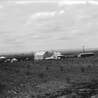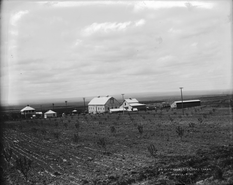 - "J.B. Van Wagener; Jerome, Idaho;" wide view of the farmstead with two-story house, lava rock barn, wooden barn, and several outbuildings.