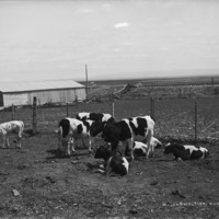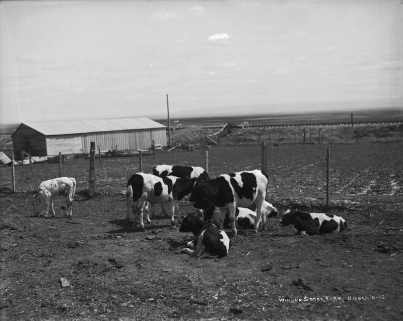 - "Winona Stock Farm;" cows in an enclosure, near Jerome, Idaho; a barn on left