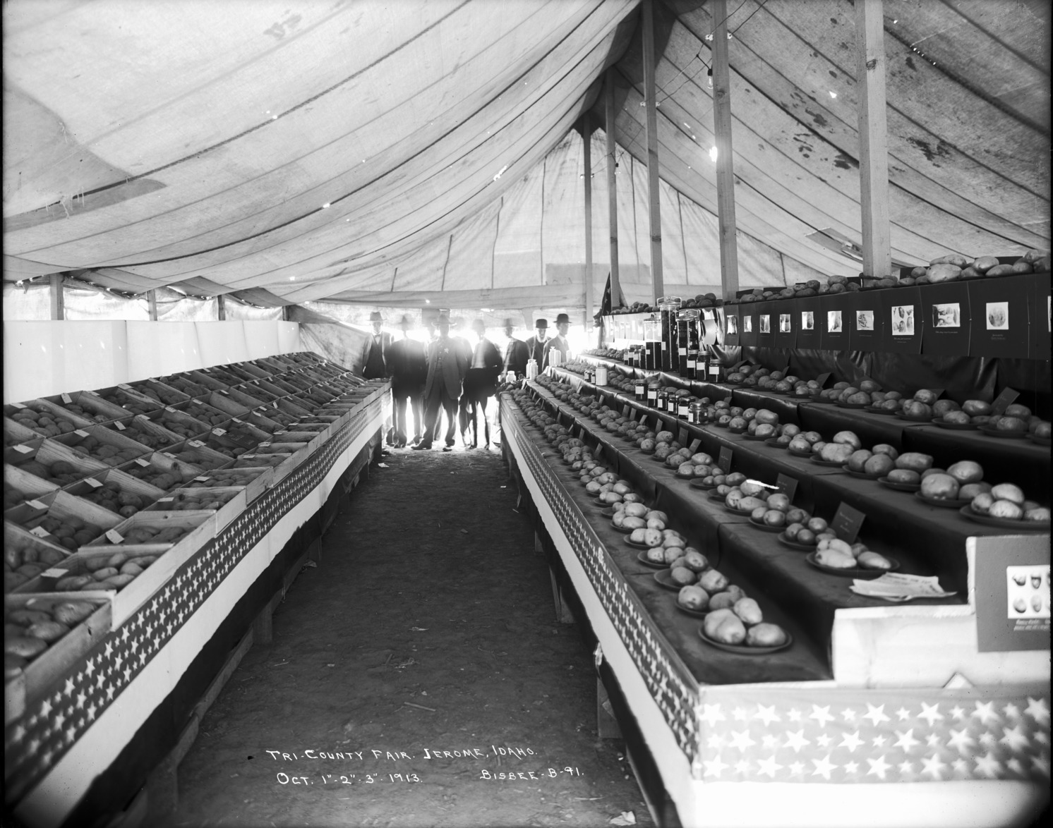 - "Tri-County Fair, Jerome, Idaho; October 1,2,3, 1913; several men stand at the opening of a produce display in a large tent
