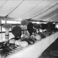 - "Tri-County Fair; October 1,2,3, 1913; Jerome, Idaho;" a man stands alongside a produce display in a large tent
