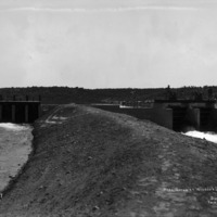 - "Head Gates at Wilson's Lake;" view along berm beside gates of North Side; a man stand at the gates; a building in background at right