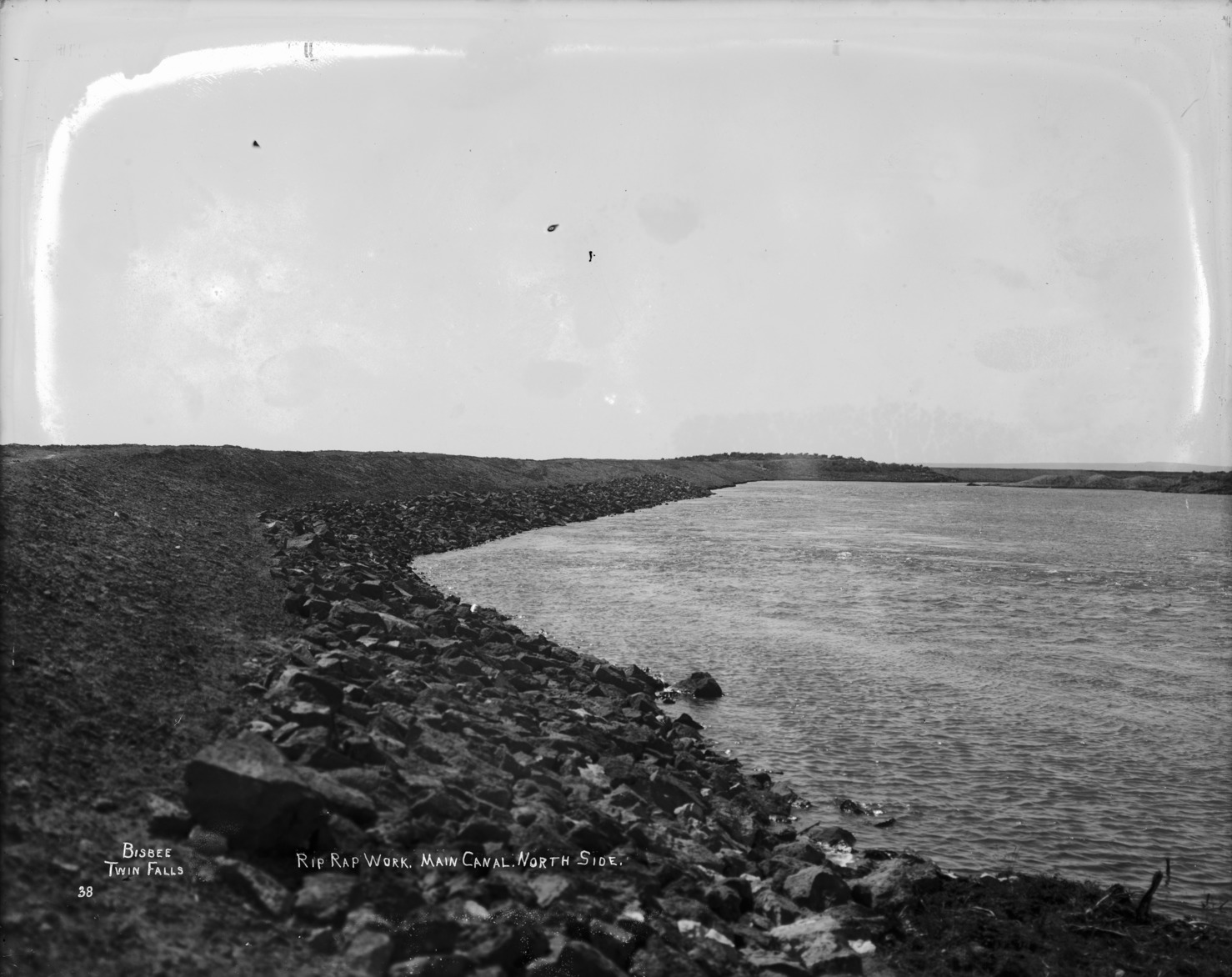 - "Rip Rap Work, Main Canal. North Side;" loose rocks line the canal