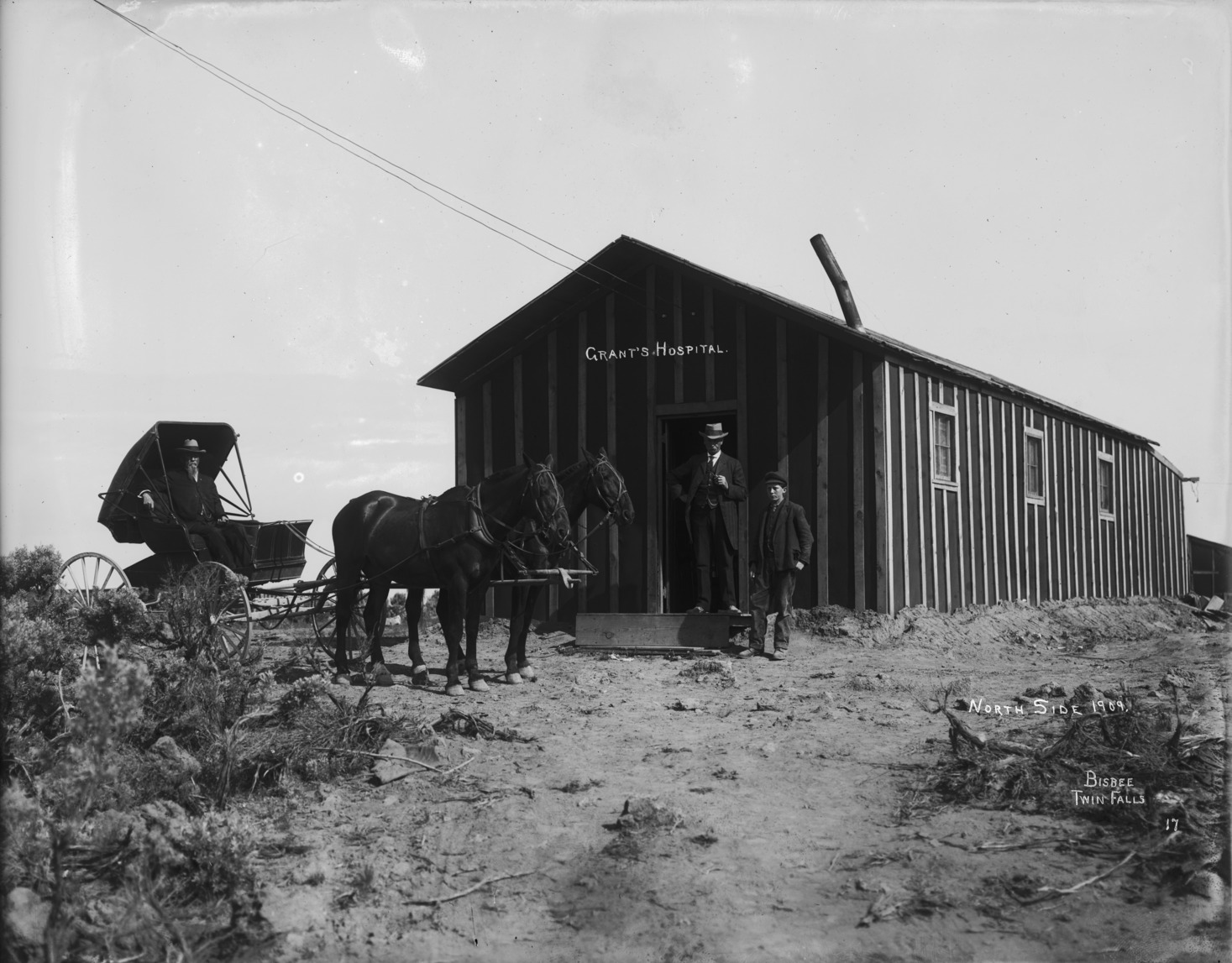 - "Grant's Hospital; North Side 1909;" a tarpaper building. A man and boy stand in front, while another man sits in a buggy driven by two horses looks on.