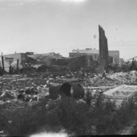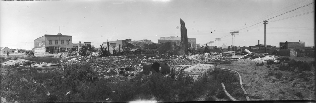 - Panoramic view of the remnants of a destroyed building in the downtown area; other buildings or businesses visible include the Jones Block, the Idaho Department Store; Hunt, Undertaker