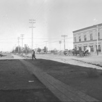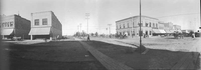 - Panoramic view of the intersection of Main Ave and Shoshone St; businesses and buildings visible include Eldridge's Clothing Store; First National Bank; Twin Falls Hardware Co., Young's Grocery and Seed House
