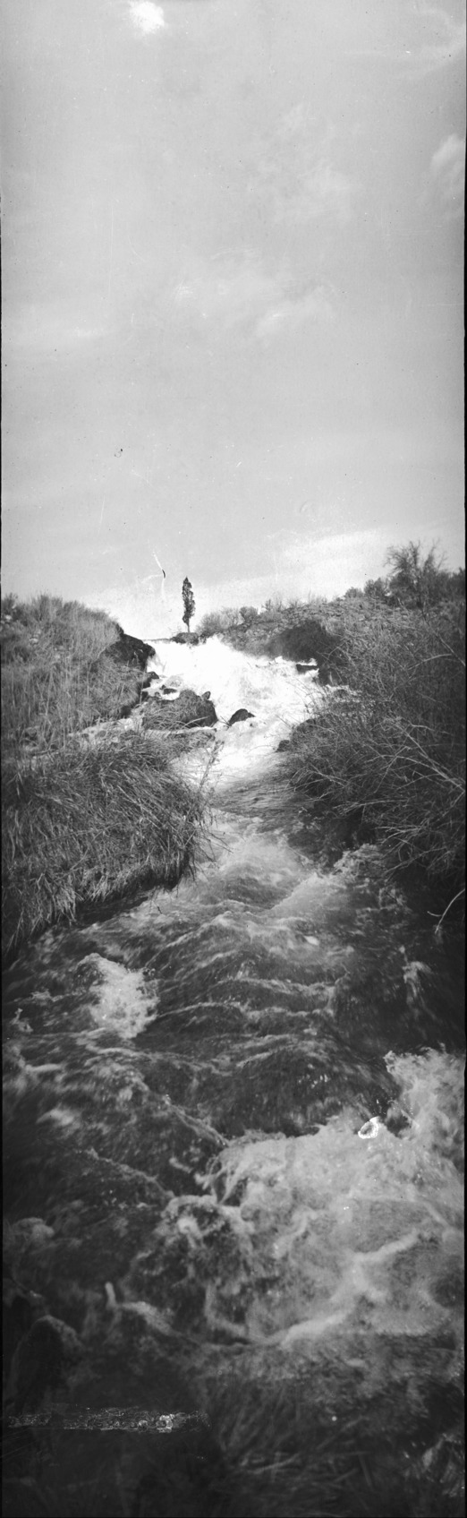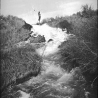 - An irrigation ditch or small creek flowing rapidly down a slope.