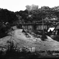 - A homestead situated alngside a canyon wall; several people pose in front of a cabin; another cabin, canvas tent, and horses and buggy are visible.