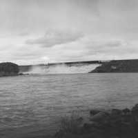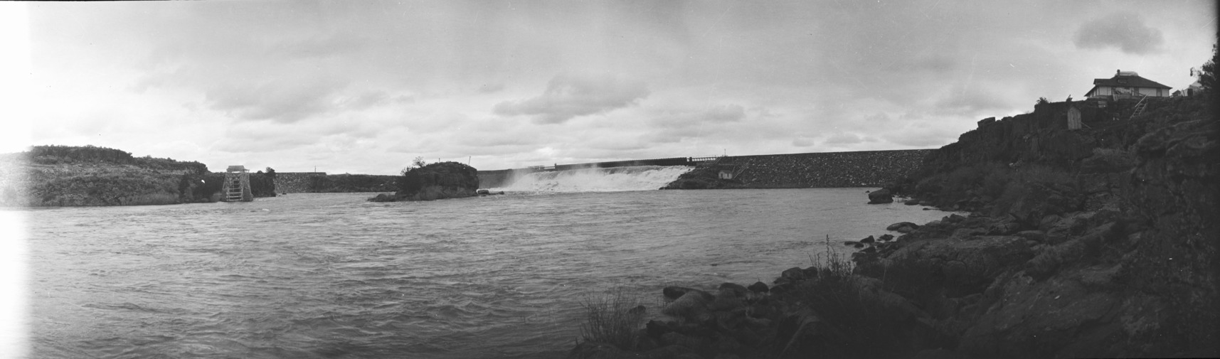 - Panoramic view of the Milner Dam headgates and Reservoir. Wooden water wheel visible at left; Milner Inn at right