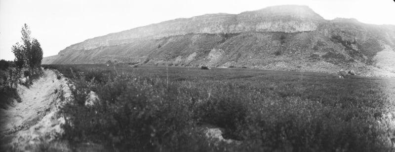 - Panoramic view of a field at the bottom of a canyon; a large dirt ditch on left.