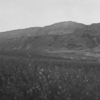 - Panoramic view of a field at the bottom of a canyon; a large dirt ditch on left.
