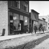 Panoramic view of Main Ave, looking northwest. A man on a horse speaks with two men standing on the wooden boardwalk and several people cross the street in the background. Visible businesses and buildings include: The Hub; Dr F. W. Pike, Physician and Surgeon; Star Restaurant; Sweeley and Sweeley; Idaho Department Store; Bedford Drug; Boyd buidling; Hotel Perrine; Eldrige's Clothing Store; Pioneer Storage and Commission Co.