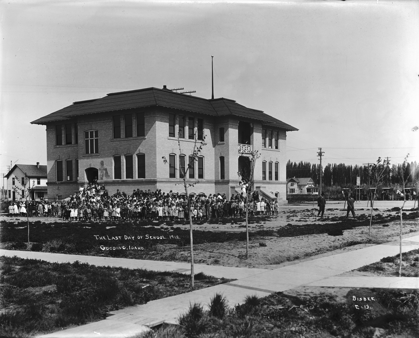 - "Last Day of School, 1912. Gooding, Idaho;" a group of children pose in front of a three story brick school. Other houses and several wagons with horses can be seen in the background.