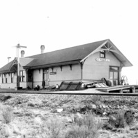 - Railroad station (depot) in Filer, a man stands in front.