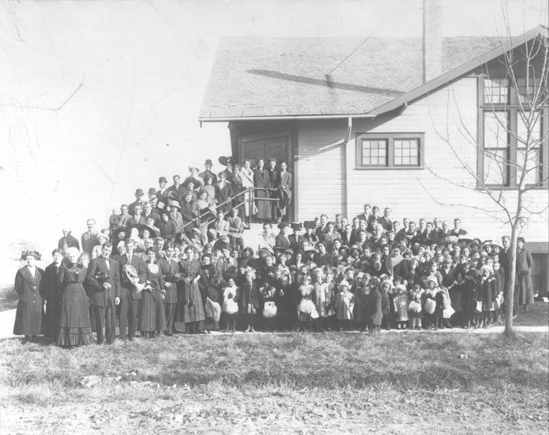 - Group of people, children and adults, posed on the steps and entrance of the First Christian Church. {Other denominations that used the building included the Immanuel Lutheran Church, Grace Baptist Church, Gospel Temple Church, and Reformed Church,}