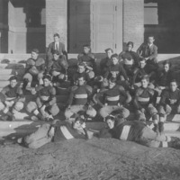 Twin Falls High School football team pose on the steps of Bickel School. Top row: B. H. (Bruce) McMillan, Manager; E. R. Dooley, coach (?). 2nd row: Dave Girdner; Rex Bailey; Jake (Jacob) Sinema; Orval Blades; Chas (Charles) Montgomery. 3rd row: Dana Elliott; Glenn Fitzpatrick; Curtis Bowers; Roy Weaver. 4th row: Cleve Costello; Sid McDonald; Harry Knight; Dan Adams; Rollo Crater; Chet Oakley. 5th row: Chas (Charles) Younger; Eugene Meigs