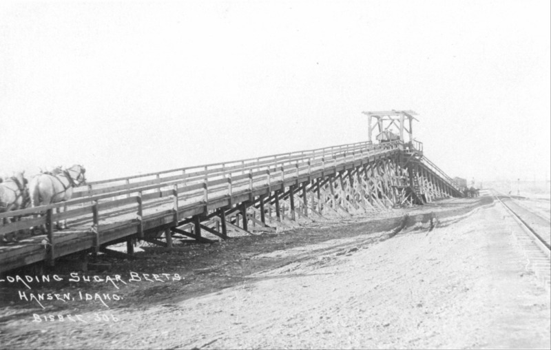 - "Loading Sugar Beets. Hansen, Idaho;" teams of horses pull wagons loaded with beets up an inclined wooden dumping device, alongside the railroad tracks.