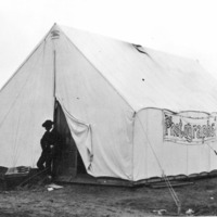 - Clarence E. Bisbee posing in front of his photography tent studio.