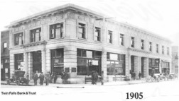 The Twin Falls Bank and Trust; with people on the sidewalks and an automobile (car) parked along the Main Ave side of the building. {May be from a calendar.}