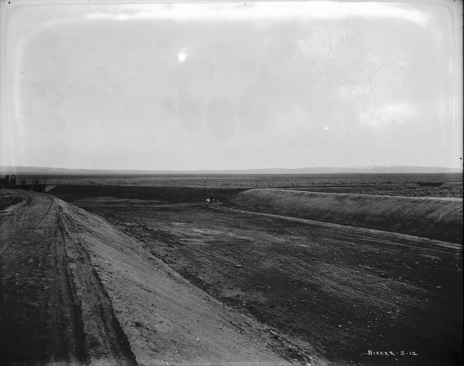 - Wide view of a dry canal bed. A man stands inside the bed in center background; gates are to left.