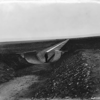 - A man stands in a canal flume, surrounded by a rocky berm.