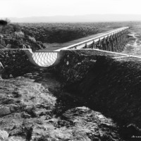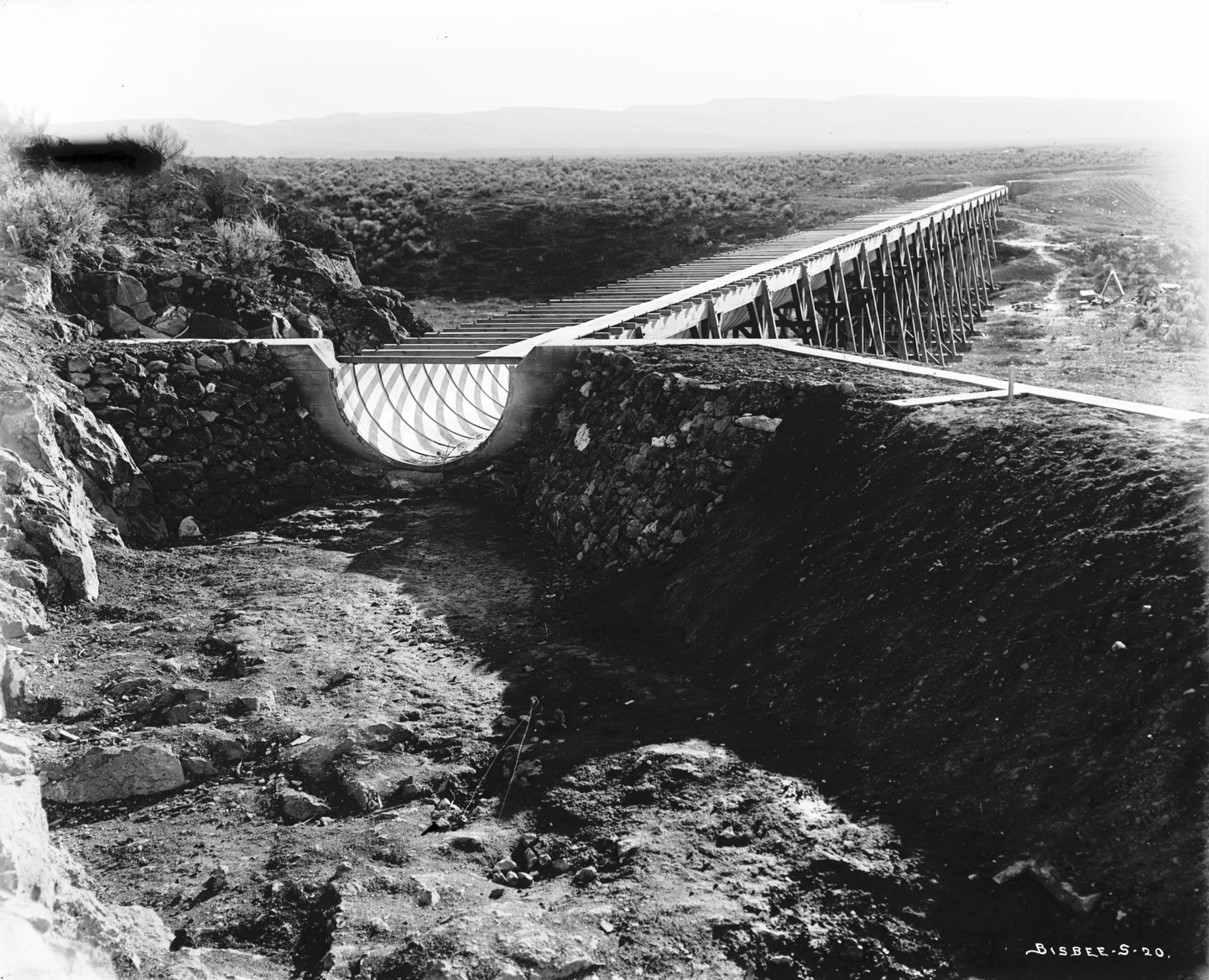 - A look down an elevated canal flume, from one end to another.