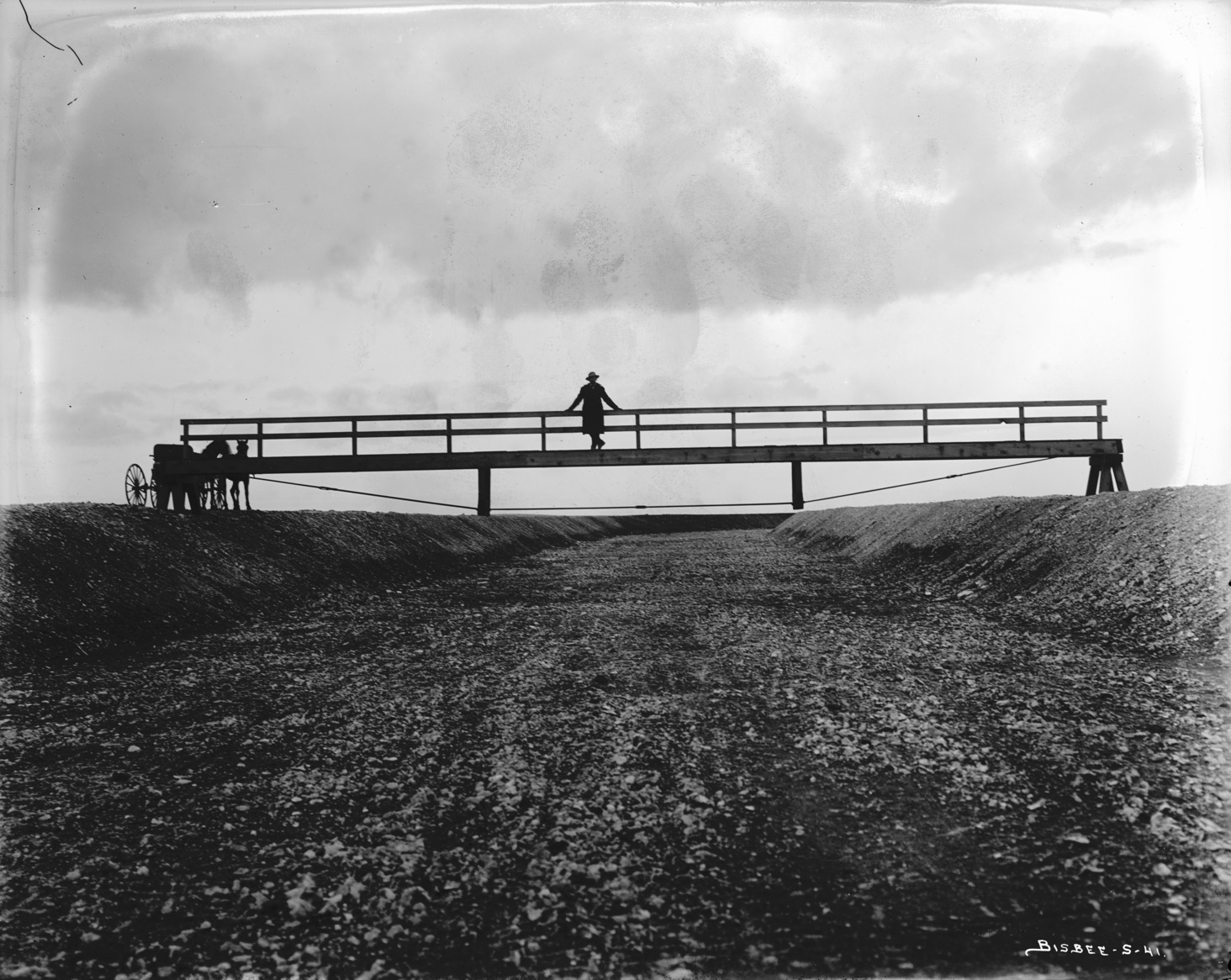 - A man stands on a low bridge over a canal. A two-horse buggy is on the berm to the left.
