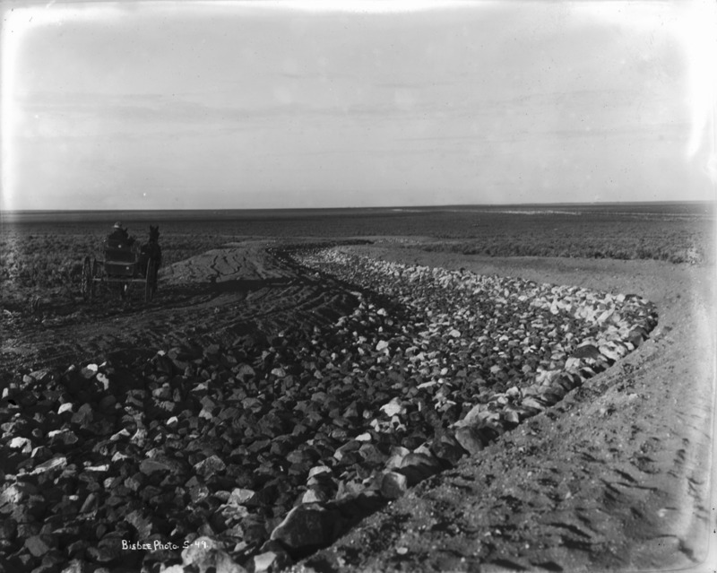 - A man in a two-horse buggy stands along the berm of a rocky, dry canal bed.