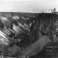 - "Salmon Dam in 1908;" view looking into the canyon where the dam is beginning construction; equipment on right.