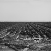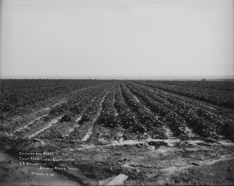 - "Orchard and Beans. First year Under Cultivation. J.E. Belleville. Salmon River Tract;" wide view of irrigated fields; house in left background.