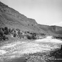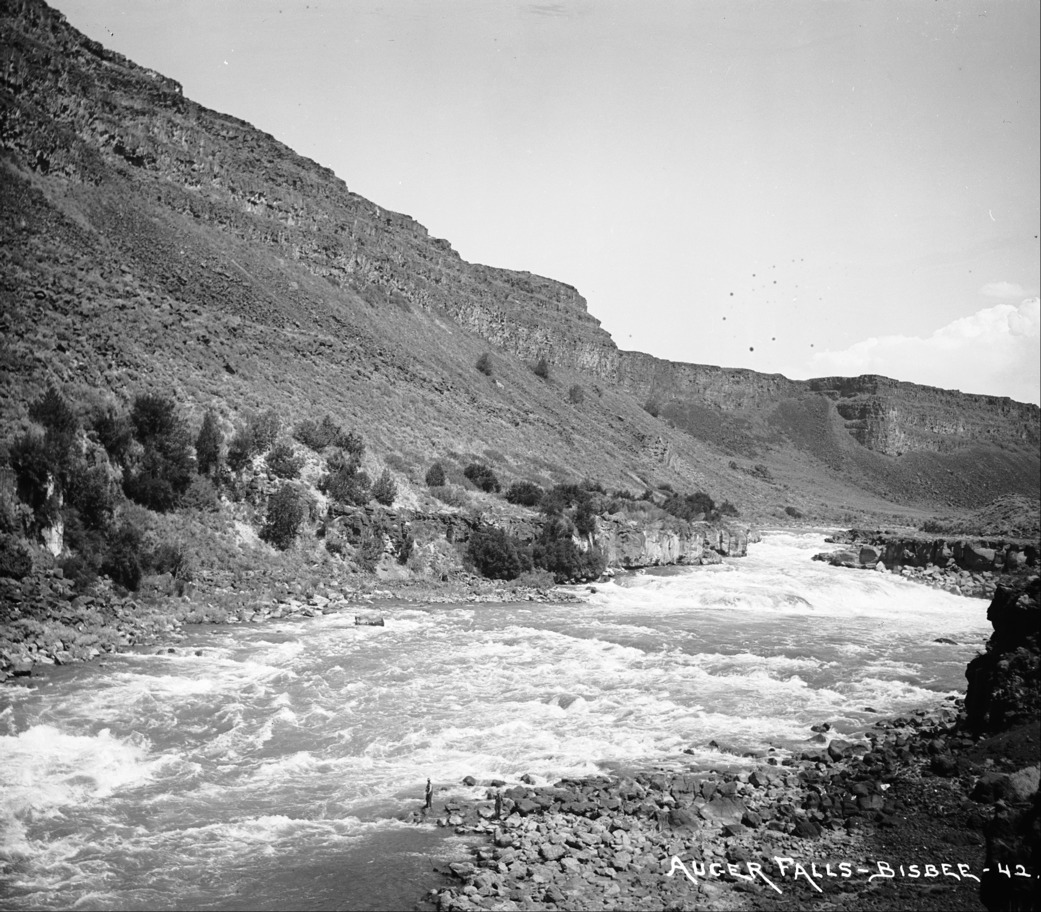 - "Auger Falls;" rapids on the Snake River south of Jerome, Idaho. Two men stand on rocky bar at the right, one holds a fishing pole.
