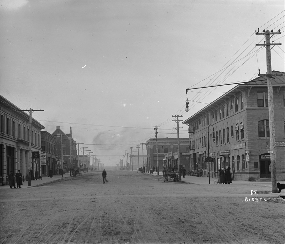 Looking southwest down Shoshone St, from the intersection with Main Ave. The roads are unpaved and many people populate the sidewalks. The Twin Falls Bank and Trust building on left and Hotel Perrine on right. Other businesses visible include Priebe Jewelry, Twin Falls Realty Company, the Perrine Hotel Cigar Store, the Rexall Drug Store.